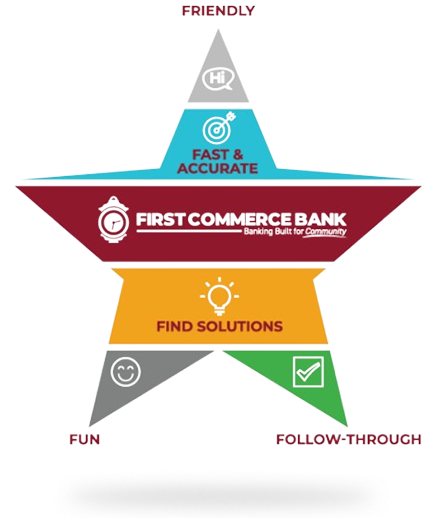 First Commerce is dedicated to relationships, providing people, businesses, and communities in our markets with high-quality products and services and superior customer service. We will deliver these through secure, user-friendly, and cutting-edge technology, ensuring our offerings are competitive.